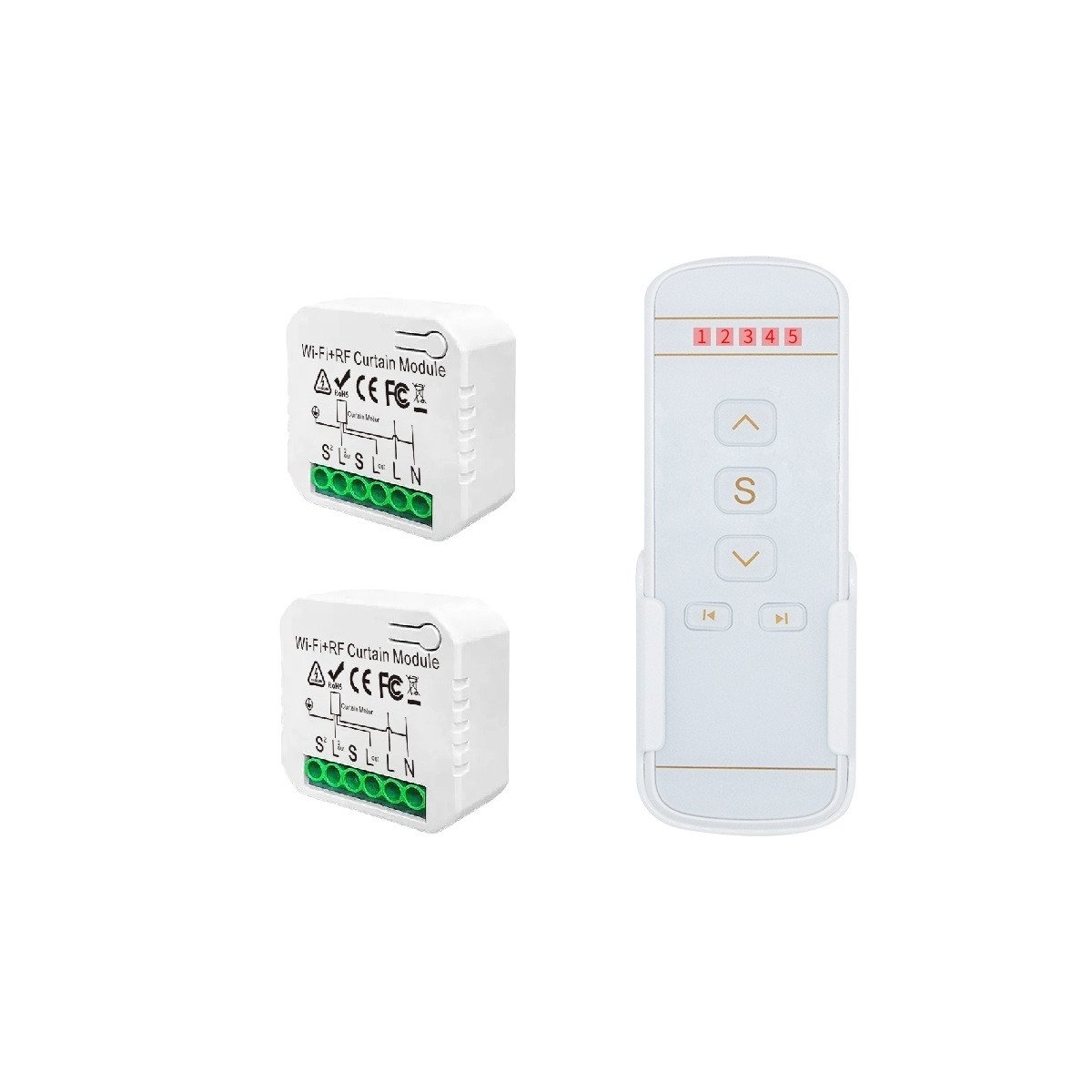 Zautomatyzuj dwa okna jednym zestawem. Dwa moduły dopuszkowe WiFi Tuya oraz pilot 5-kanałowy pozwalają wygodnie otwierać, zatrzymywać i zamykać rolety/zasłony z telefonu lub fizycznym pilotem.