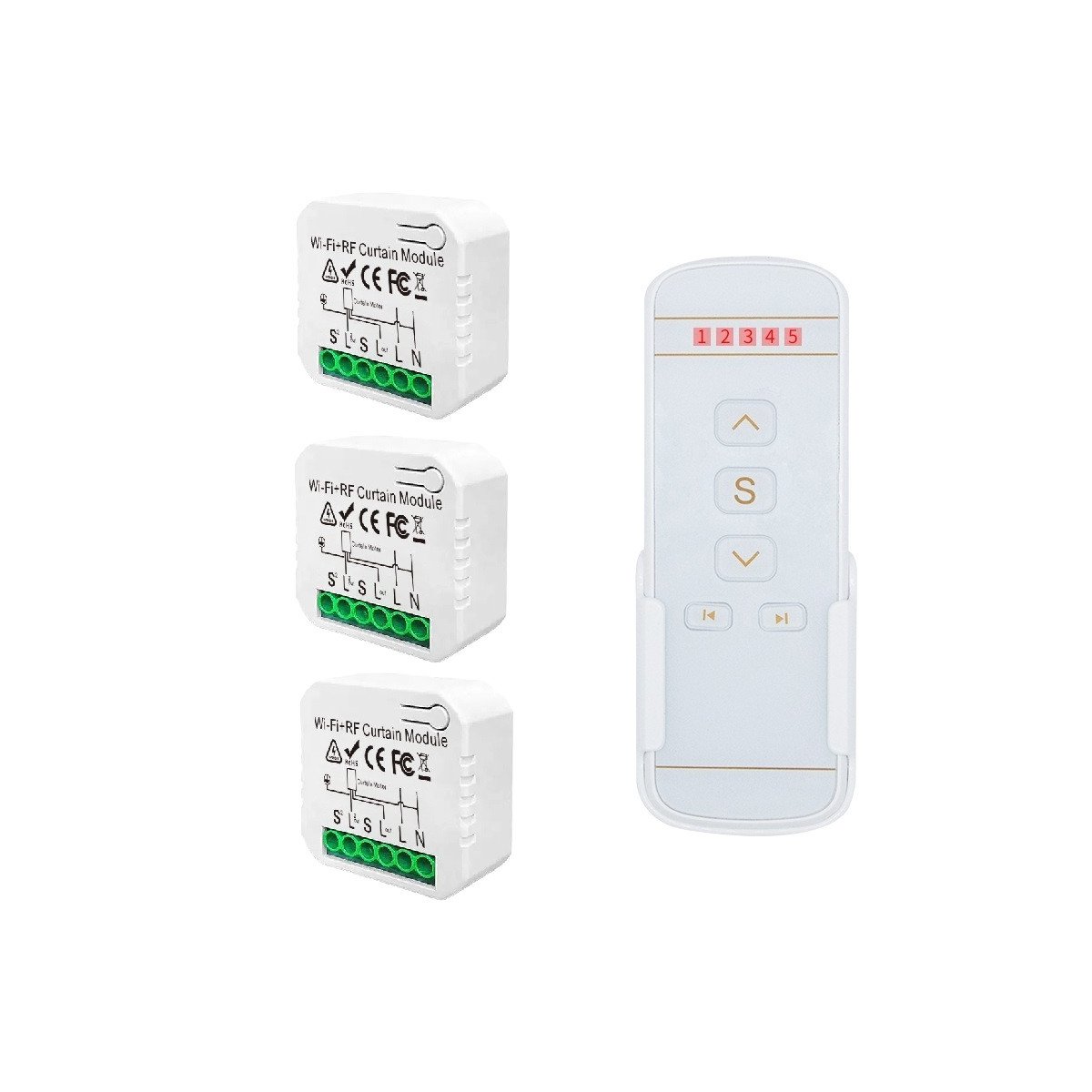 Zautomatyzuj trzy okna jednym zestawem. 3 moduły dopuszkowe WiFi Tuya oraz pilot 5-kanałowy pozwalają wygodnie otwierać, zatrzymywać i zamykać rolety/zasłony z telefonu lub fizycznym pilotem.