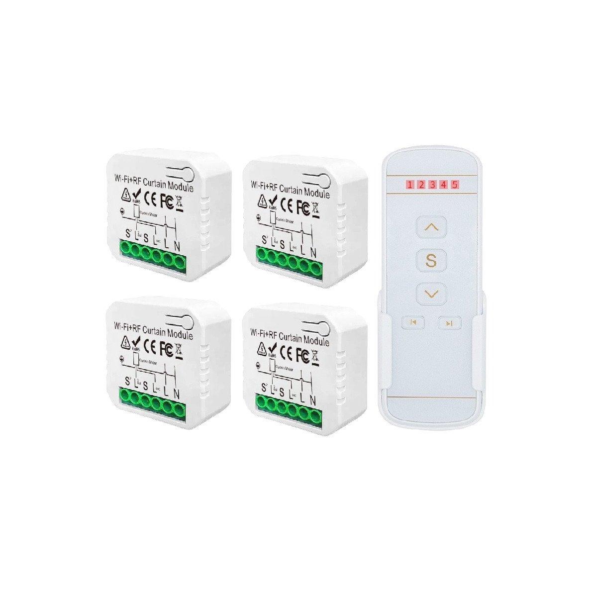 Kompletny zestaw do czterech okien. 4 moduły dopuszkowe WiFi Tuya i pilot 5-kanałowy pozwalają z telefonu lub pilotem otwierać, zatrzymywać i zamykać rolety/zasłony – w domu i poza nim.