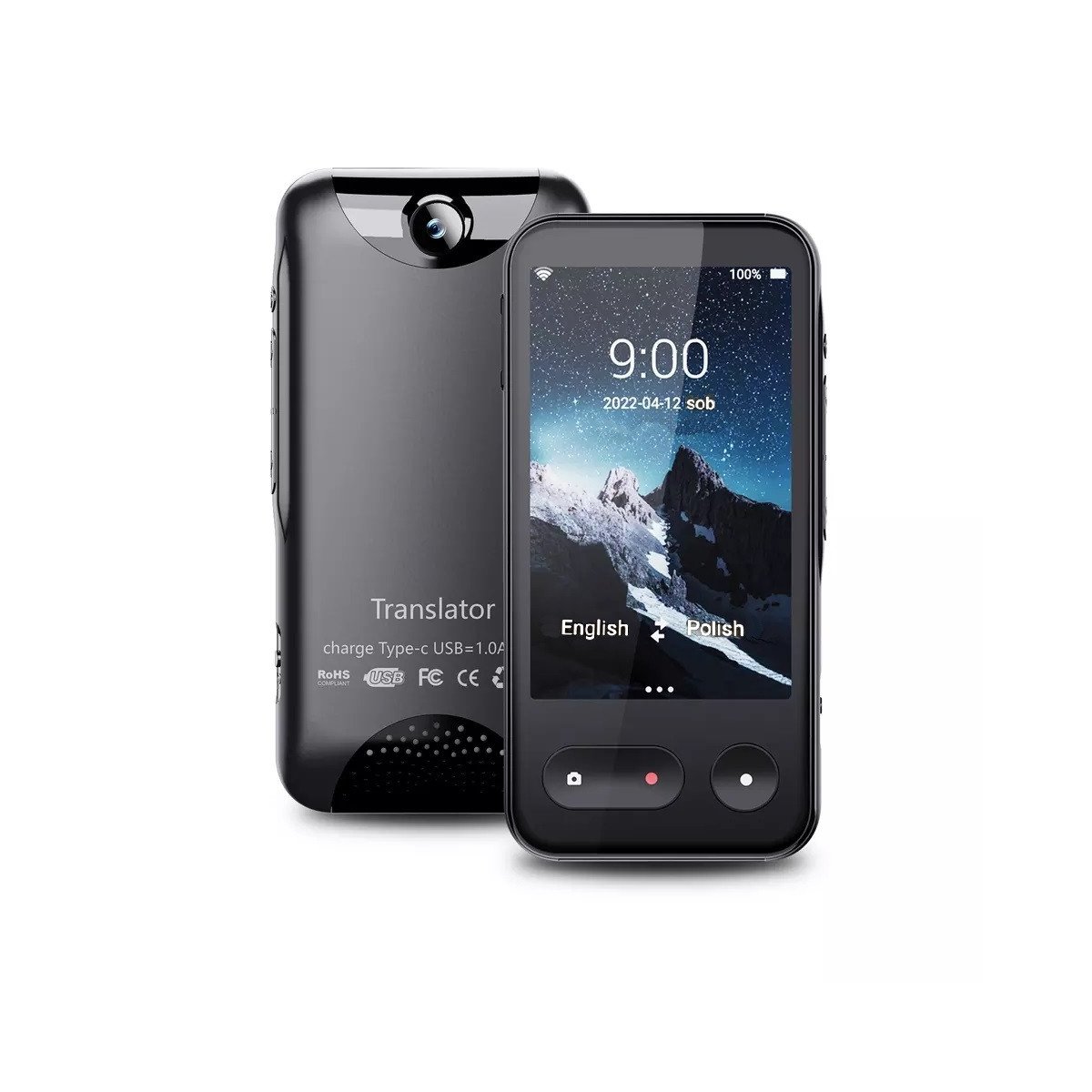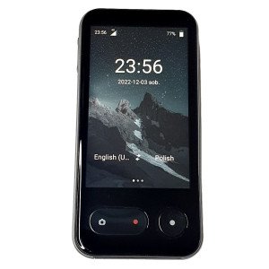 Akumulator 4000 mAh wystarcza na długie godziny. Ekran 4" ułatwia wybór języków, przeglądanie historii tłumaczeń i szybkie robienie zdjęć z tłumaczeniem tekstu.
